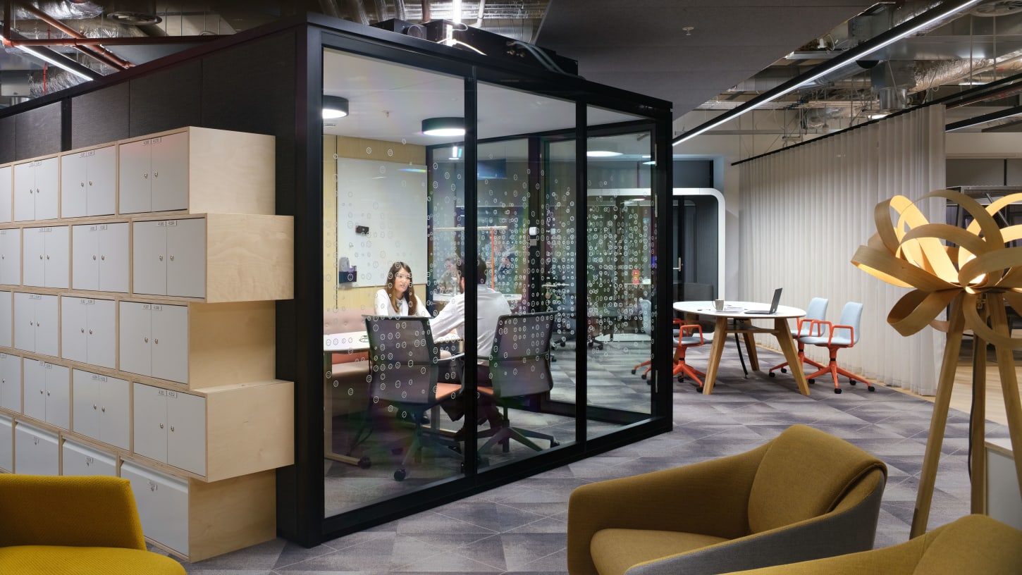 In totaal 38 THINK.TANK.II modules in twee op elkaar afgestemde formaten structureren de open ruimtes. Dankzij hun dubbele beglazing en akoestische optimalisatie bieden ze ideale toevluchtsoorden voor vertrouwelijke gesprekken of geconcentreerd werken.