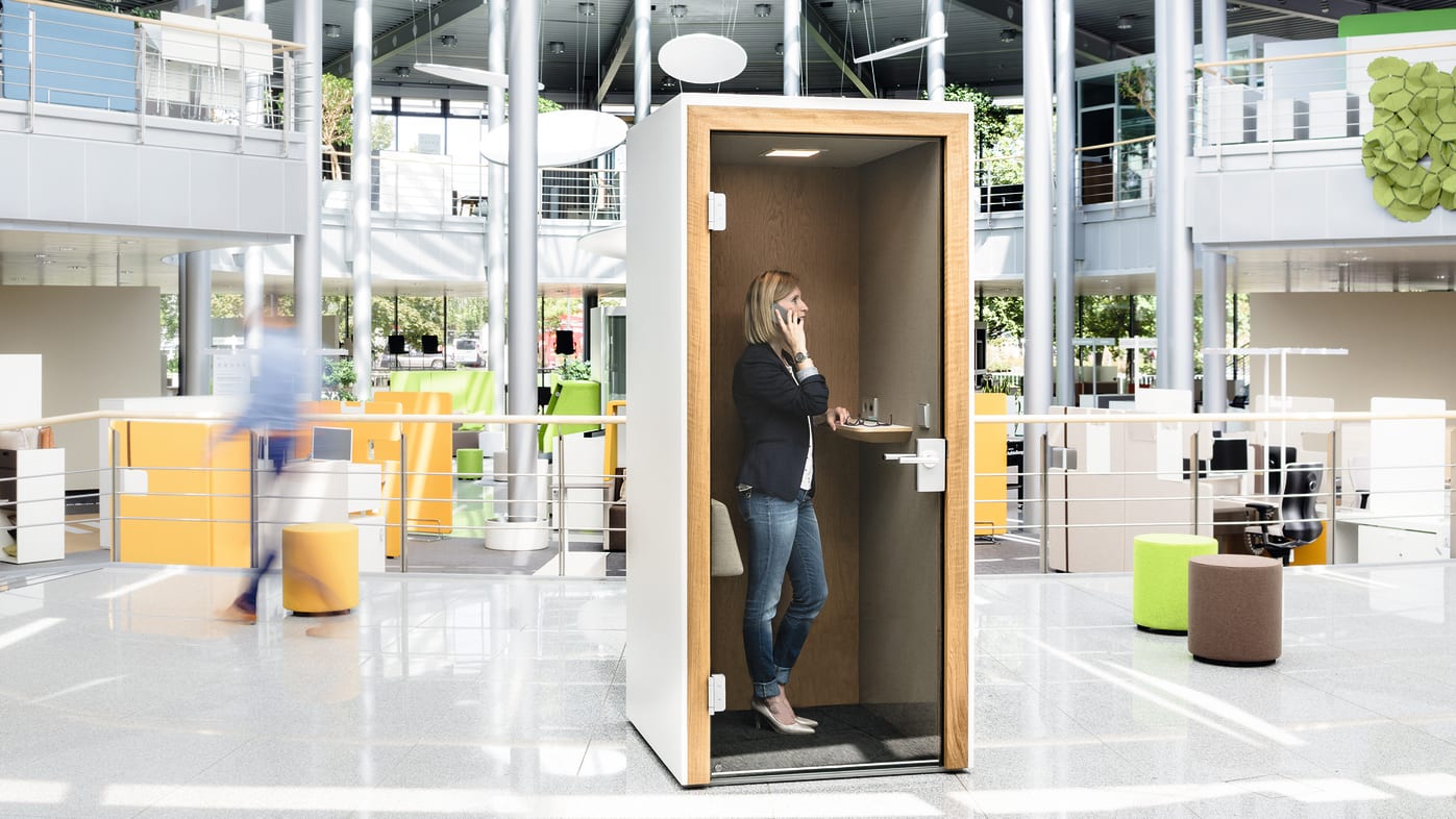 Wir liefern die akustisch wirksame QUIET.BOX inklusiv Belüftung, Beleuchtung und Stromanschluss. Sie fügt sich überall, selbst in Durchgangsbereichen, harmonisch ein.
